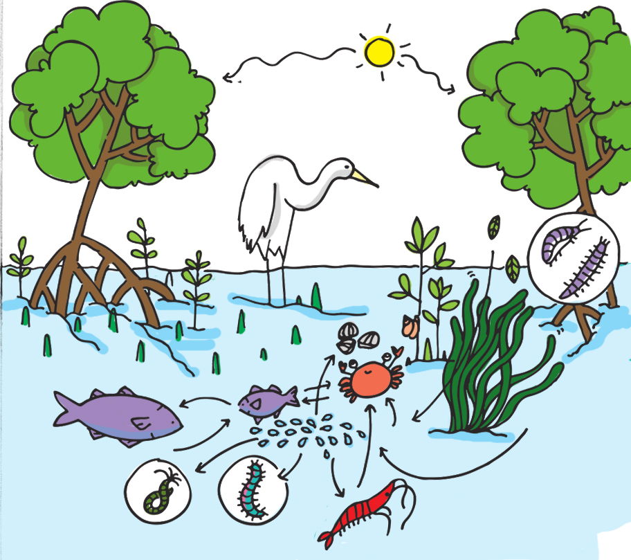 Rừng ngập mặn cung cấp môi trường sống và thức ăn cho nhiều loài.[5] Rừng ngập mặn là ngôi nhà cho nhiều loài sinh vật hoang dã như cá sấu, chim, hổ, hươu, khỉ và ong.[6] Rất nhiều loài chim di cư phụ thuộc vào rừng ngập mặn như sếu, bồ nông, cò thìa. Bên dưới mạng lưới phức tạp của rễ cây ngập mặn còn là một hệ sinh thái độc đáo, là môi trường yên tĩnh, an toàn cho con non của các sinh vật trú ngụ trong giai đoạn đầu đời. Tôm và tôm hùm bùn sử dụng đáy bùn làm nhà. Cua ngập mặn ăn lá rừng ngập mặn. Lá cây rơi xuống cũng bổ sung các chất dinh dưỡng cho bùn, trở thành nguồn thức ăn cho nhiều sinh vật đáy khác.
