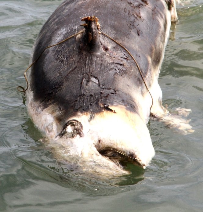 Xác bò biển với vòng dây lưới quanh cổ tại khu bảo tồn biển Phú Quốc, Kiên Giang 2014.[8]